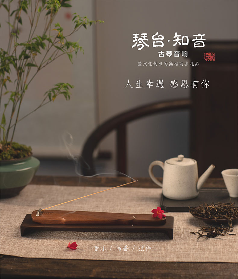以檀木雕刻的古琴造型为香插底座,内置《高山流水》等八首古琴名曲。并且可以连接蓝牙播放。这款武汉特色礼品不仅造型典雅,构思精巧,还实用多能。